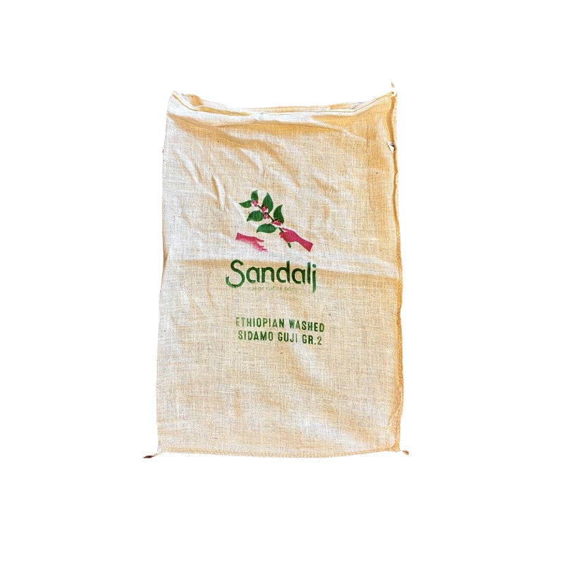 This jute bag comes from the Guji province which takes its name from a tribe of the Oromo group, in the wider area of Oromia. The area is ideal for coffee cultivation, not only for its climatic and altitude factors, but also for the nature of the soil, volcanic and therefore fertile and rich in nutrients.In this region, known for a high quality coffee production, growers use to manually harvest ripe cherries, ensuring an high homogeneity of the harvest as well as a correct degree of maturation of the drupes. In Guji washed coffees, it is expected to savor intense citrus notes, a high acidity alleviated by flowery tones and a pleasantly clean body.