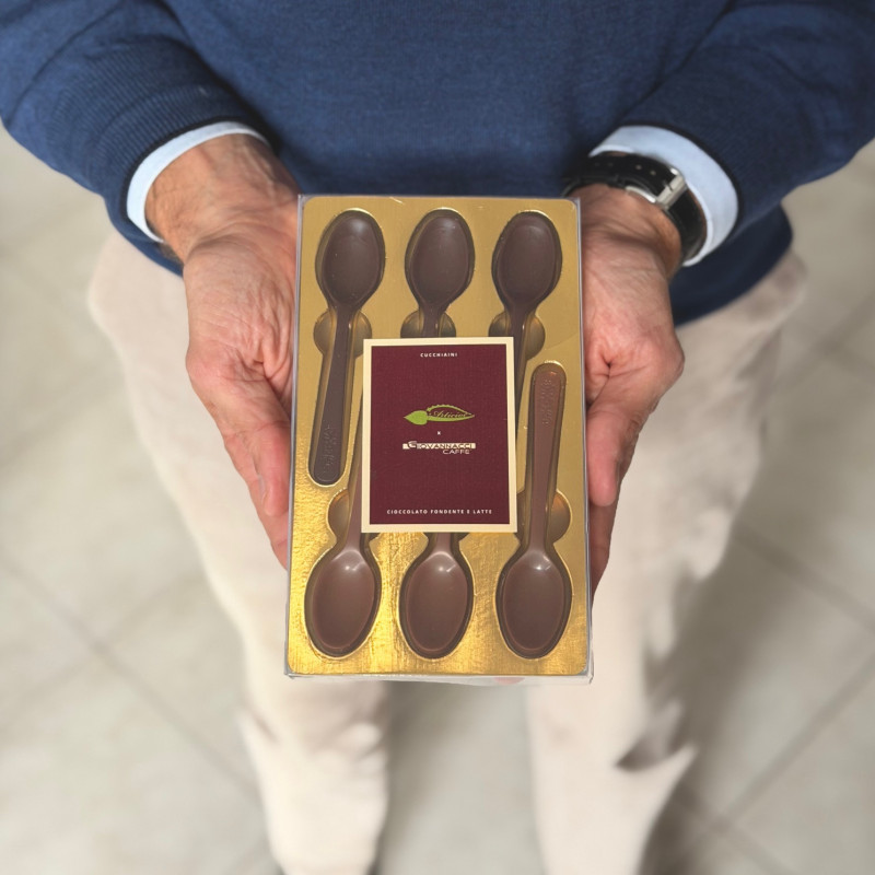 Set da 6 cucchiaini di fine cioccolato, 3 fondenti e 3 al latte. Ideati dal maitre chocolatier per accompagnare perfettamente il tuo caffè espresso.